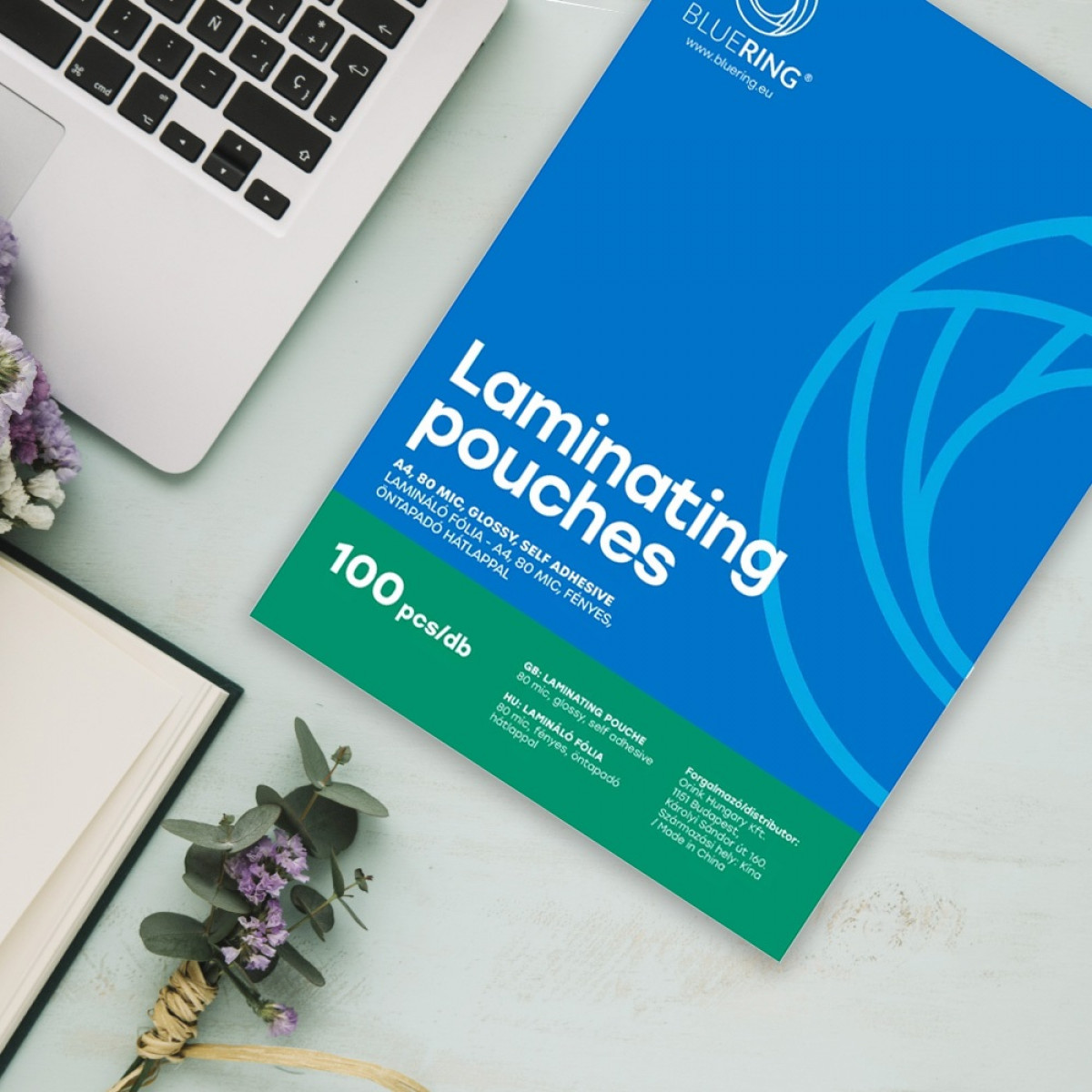 Lamináló fólia A4, 80 micron öntapadó hátlappal 100 db/doboz, Bluering®, bemutatása